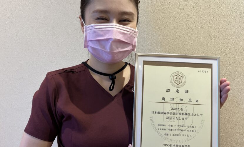 このたび、当院の歯科衛生士 角田 が、日本歯周病学会の「認定歯科衛生士」資格を取得いたしました!角田は明るく優しい3児の母で、仕事と家庭を両立させながら、いつも笑顔を絶やさず、患者さんに寄り添ったケアや治療を提供しています。